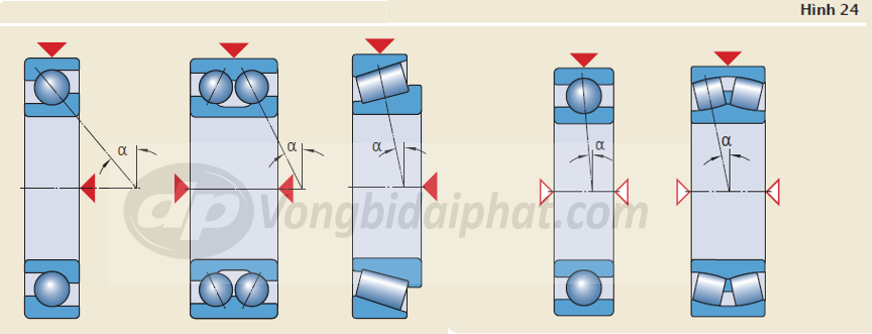 Khả năng chịu tải dọc trục của ổ bi đỡ tùy thuộc vào thiết kế bên trong của ổ bi và khe hở trong sau khi lắp. Trong trường hợp có tải tổng hợp, các loại ổ bi tiếp xúc góc một dãy và hai dãy, ổ côn lắp đơn thường được sử dụng mặc dù ổ bi đỡ và ổ tang trống cũng phù hợp (hình. 24).
