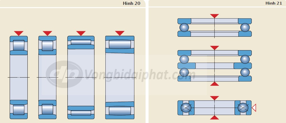 Vòng bi chặn và vòng bi tiếp xúc bốn điểm (hình 21) chỉ chịu tải dọc trục nhẹ và trung bình. Vòng bi chặn một hướng chỉ có thể chịu được tải dọc trục ở một hướng.