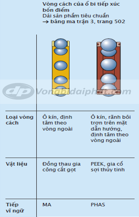 Ổ bi tiếp xúc bốn điểm: là ổ bi tiếp xúc góc một dãy với rãnh lăn được thiết kế để chịu tải dọc trục cả hai phía. Đối với tải dọc trục cho sẵn, ổ bi có thể chịu một lượng tải hướng kính giới hạn. Các ổ bi này chiếm một khoảng không gian dọc trục ít hơn ổ bi hai dãy. Vòng trong tách rời. Cho ổ bi khả năng có nhiều viên bi hơn để có thể chịu tải trọng cao hơn. Ổ bi có thể tách rời được, tức là vòng ngoài cùng với cụm con lăn và vòng cách có thể được lắp riêng so với hai nửa vòng trong.