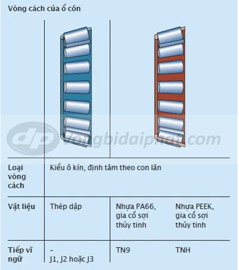 Vòng bi côn SKF được lắp với vòng cách tiêu chuẩn bằng thép dập, vòng cách polymer.Các chất bôi trơn thường được dùng cho vòng bi không ảnh hưởng đến tính chất của vòng cách. Tuy nhiên, một vài loại dầu tổng hợp, mỡ có dầu gốc tổng hợp và các chất bôi trơn có một tỷ lệ phụ gia EP cao, khi làm việc ở nhiệt độ cao, có thể có ảnh hưởng không tốt cho vòng cách polyamid