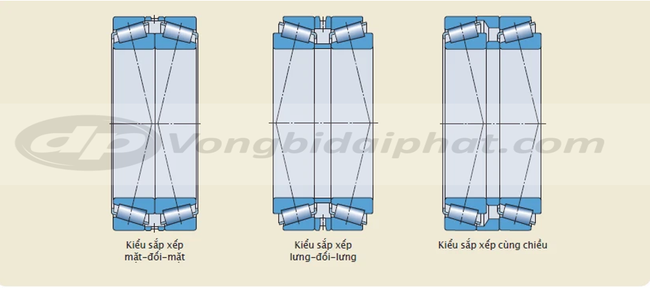 Vòng bi côn lắp cặp có thể được cung cấp đối với những kết cấu mà khả năng chịu tải của một vòng bi không đủ hoặc trong trường hợp trục cần được cố định theo phương dọc trục ở cả hai phía với một khe hở dọc trục hoặc dự ứng lực định sẵn. Các vòng bi côn và vòng chêm được chế tạo phù hợp và được cung cấp theo bộ. Khi lắp, tải hướng kính sẽ được phân bố đều giữa các ổ. Tùy theo yêu cầu, bộ vòng bi côn lắp cặp có thể được cung cấp với kiểu sắp xếp mặt-đối mặt, lưng-đối-lưng, hoặc cùng chiều