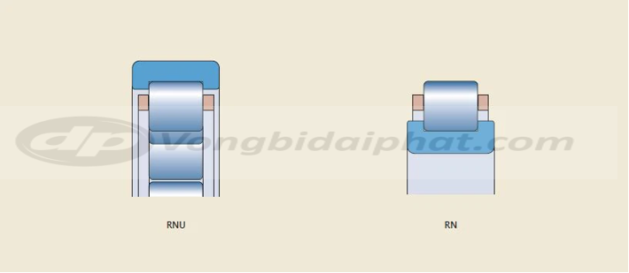 • Thiết kế kiểu NU: Vòng bi đũa kiểu NU có hai gờ chặn tích hợp trên vòng ngoài và không có gờ chặn trên vòng trong. Các vòng bi đũa này có thể chịu độ dịch chuyển dọc trục tương đối của trục so với gối đỡ ở hai phía.