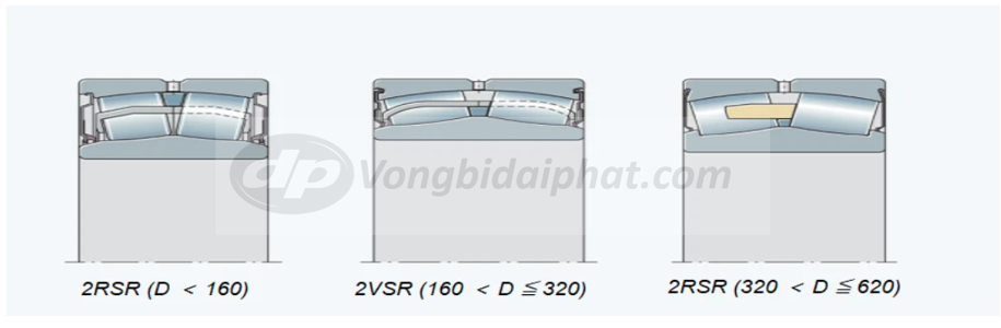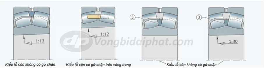 • Vòng bi tang trống theo thiết kế lỗ côn: Thiết kế lỗ côn bao gồm lỗ côn với độ côn 1:12 và độ côn 1:30. Thiết kế này được lắp đặt cùng với ống lót (măng xông). Vòng cách sử dụng cho thiết kế này gồm thếp tấm dạng ô kín không có gờ chặn trên vòng trong, và đồng thau được gia công cắt gọt có gờ chặn trên vòng trong.