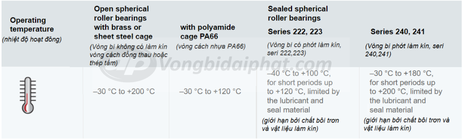 Đối với vòng bi hình cầu sê-ri 240 và 241, vật liệu làm kín tiêu chuẩn là fluoroelastomer. Phớt làm kín được làm từ chất chống oxy hóa, chẳng hạn như Viton (FKM, FPM), Các vật liệu này không nên làm nóng quá 300 ° C sẽ giải phóng khí có hại cho sức khỏe.