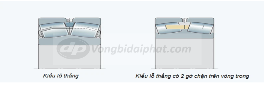 Vòng bi tang trống theo kiểu thiết kế lỗ thẳng: thiết kế này có 2 kiểu, có gờ chặn trên vòng trong và không có gờ chặn trên vòng trong. vòng cách sử dụng cho loại này gồm có thép tám và đồng thau được gia công cắt gọt để tăng độ cứng cho vòng cách.