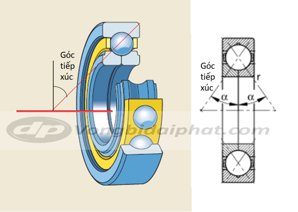 Vòng bi tiếp xúc góc có các rãnh lăn trên vòng trong và vòng ngoài lệch nhau theo phương dọc trục.